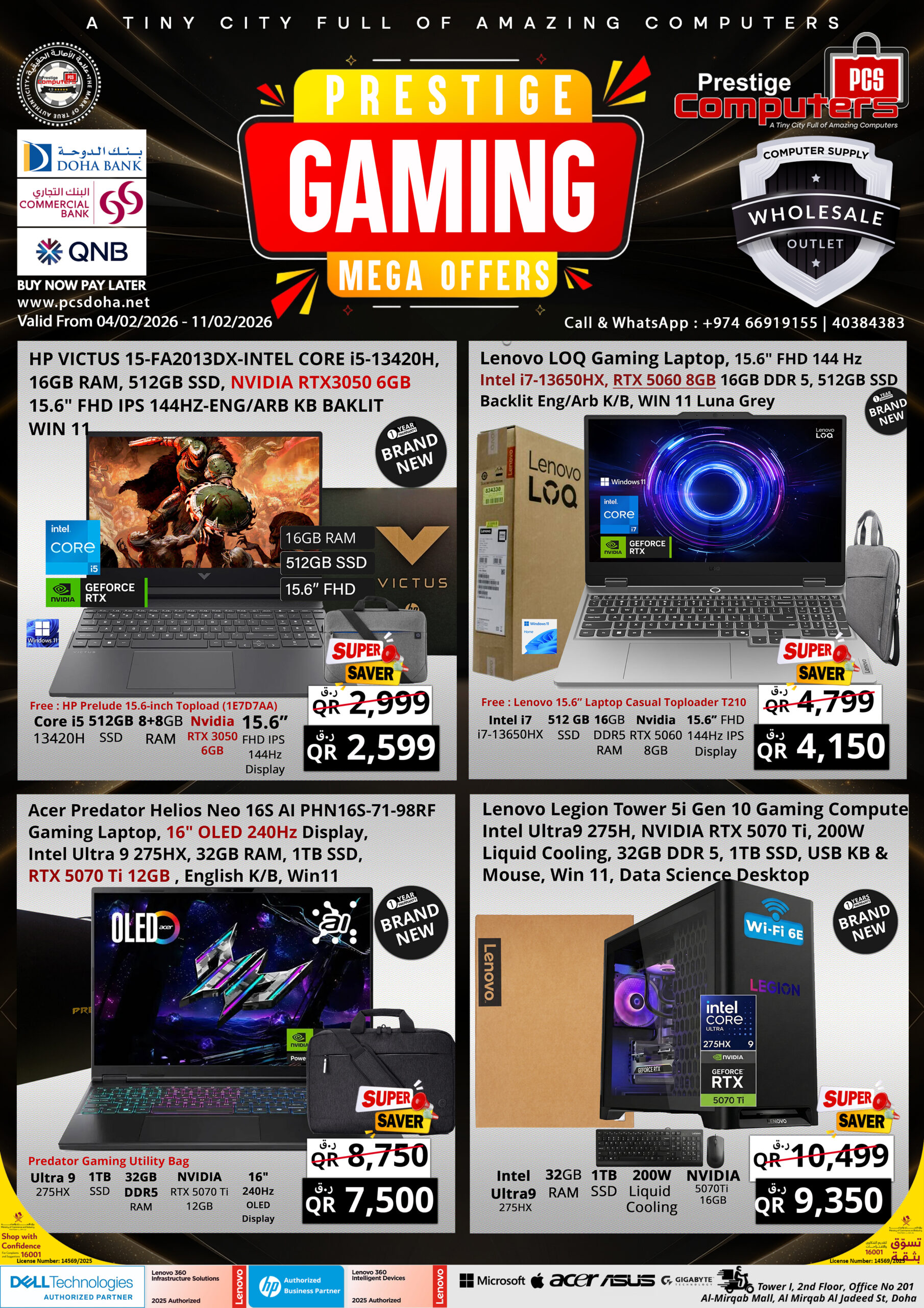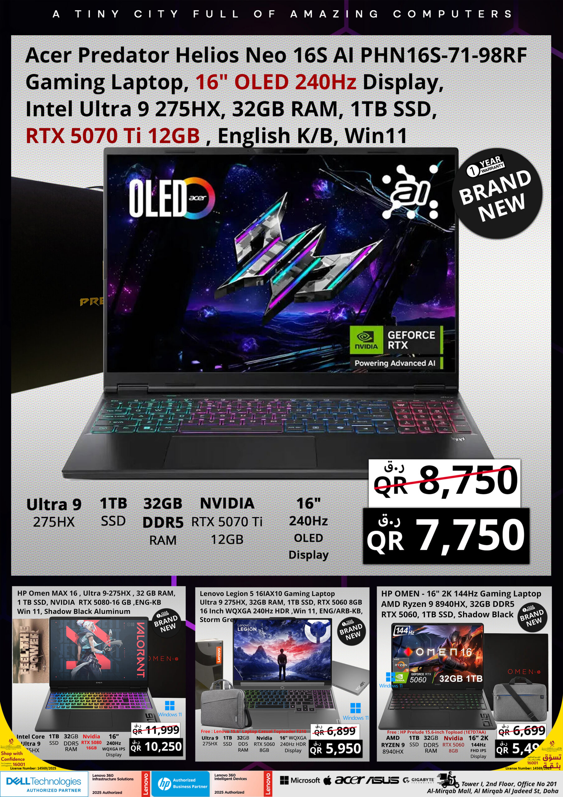 Acer Predator Helios Neo 16S AI gaming laptop in Qatar with Intel Core Ultra 9 275HX, 32GB RAM, 1TB SSD, RTX 5070 Ti 12GB, 240Hz OLED display.