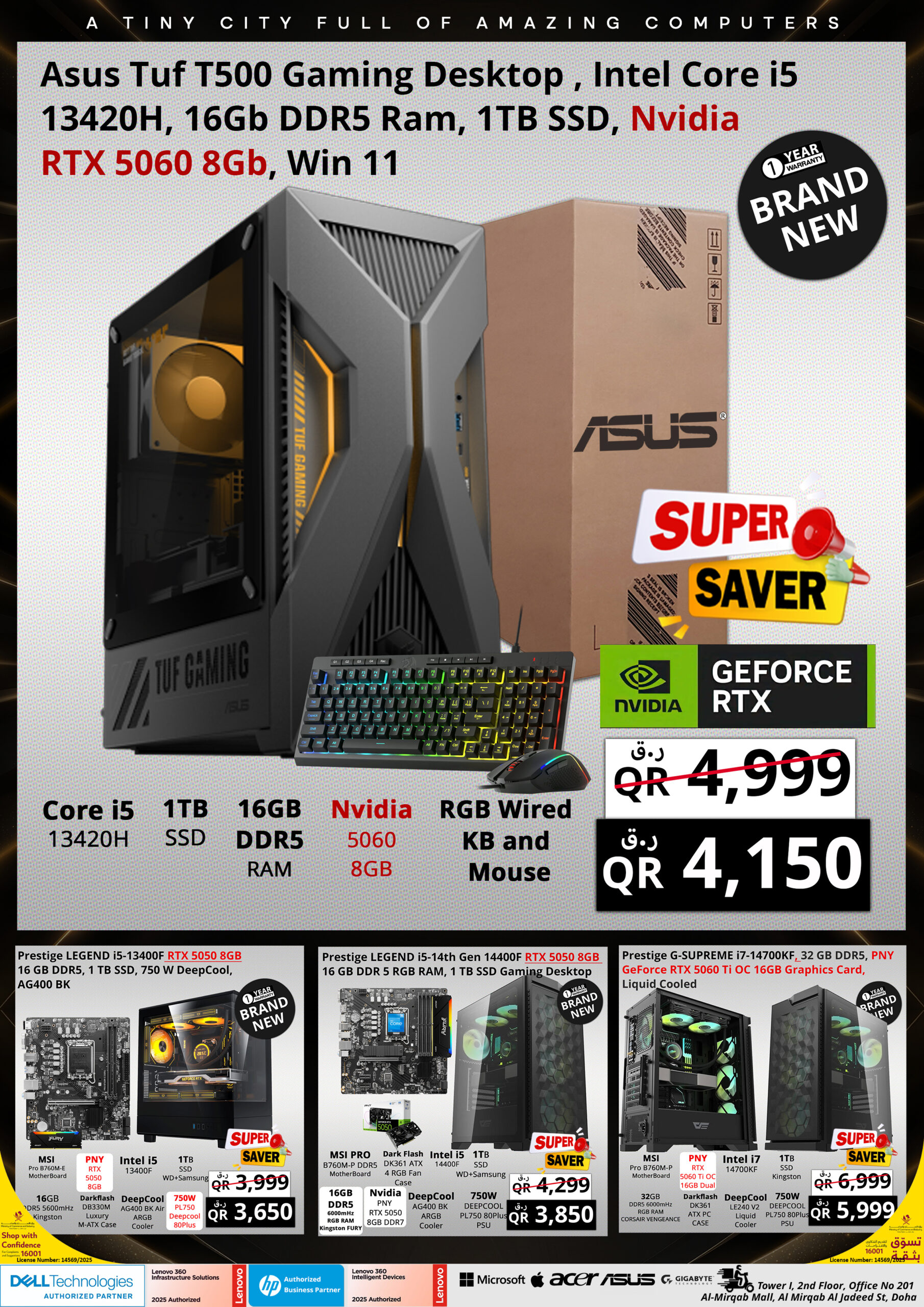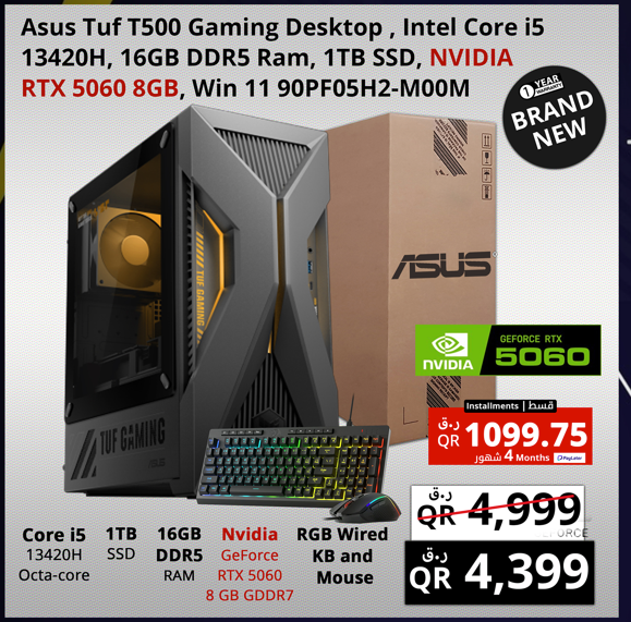 Asus Tuf T500 Gaming Desktop – Intel Core i5 13420H – 16Gb Ram -1TB SSD – Nvidia Geforce RTX 5060 8Gb Graphics – Windows11