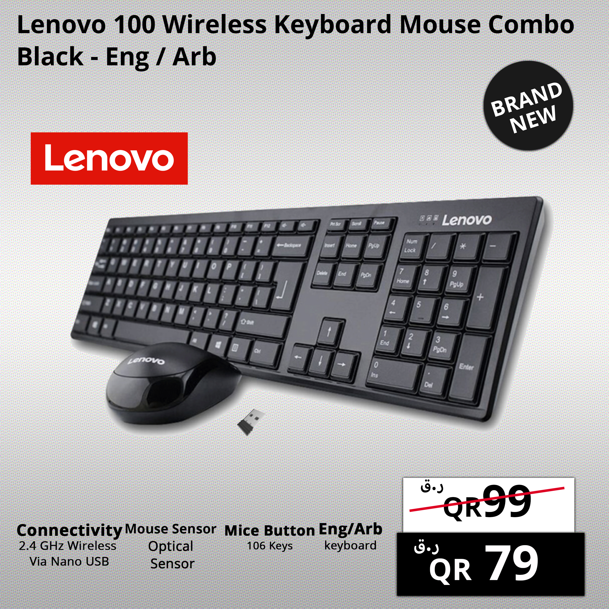 Lenovo 100 Wireless Keyboard Mouse Combo Black – Eng / Arb